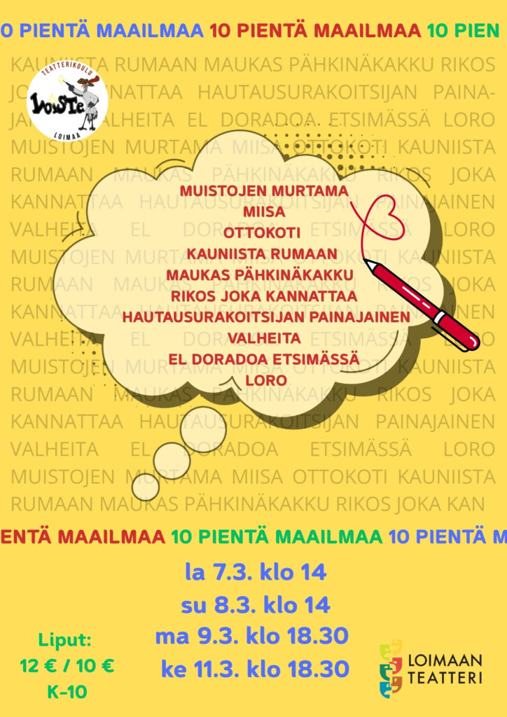 Loimaan teatterikoulu LoiSteen teatteritaiteen perusopetuksen tokavikan vuoden oppilaat ovat jatkaneet tänä lukuvuonna perehtymistä käsikirjoittamisen ja teatterin eri osa-alueiden maailmaan. Syksy alkoi Kaisa Kauppisen vetämillä kirjoituspajoilla, joiden pohjalta 10 PIENTÄ MAAILMAA esitykseen kirjoitetut pienoisnäytelmät syntyivät.